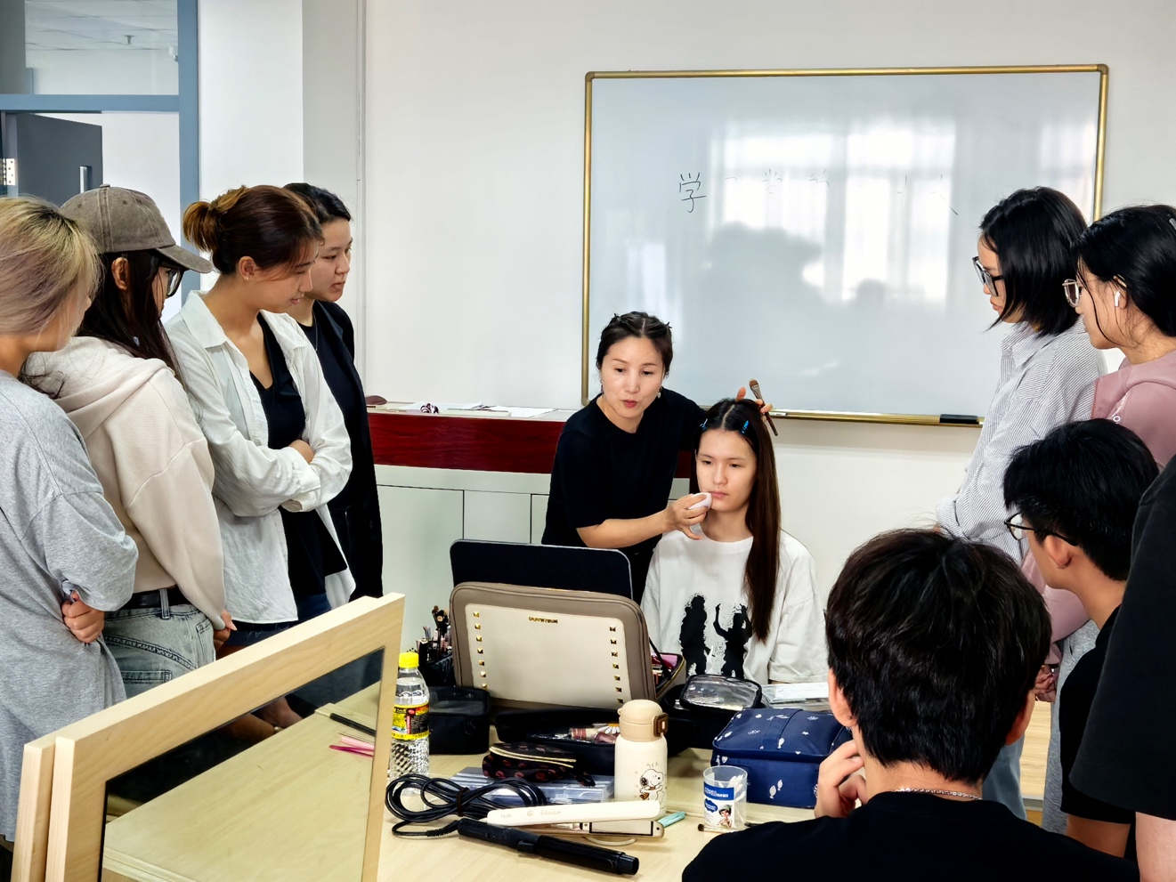 在教学示范环节,金老师分别展示了女生妆容和男生妆容的完整打造过程,从底妆、眼线、眼影、眉形,到腮红、口红与整体形象协调,逐一进行了细致讲解。在课程后半段的实践环节,金老师对每位同学的妆容作品进行个性化指导与专业建议,课堂互动积极,学习氛围热烈。