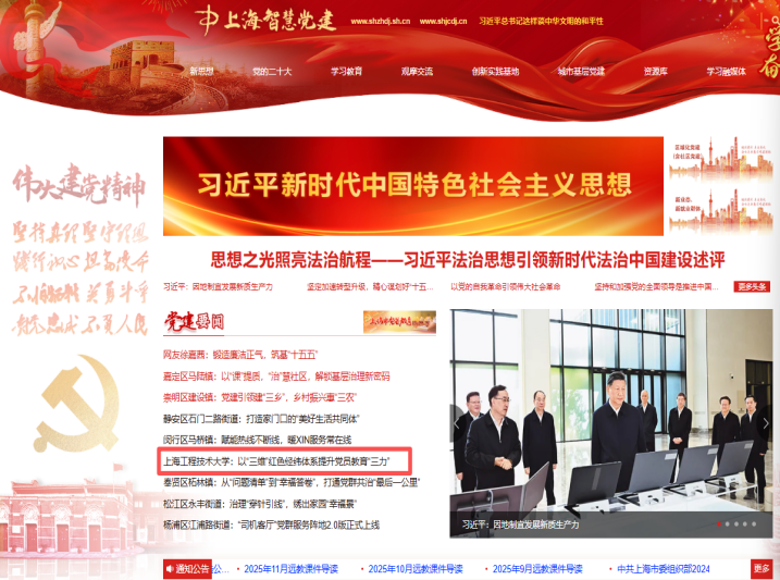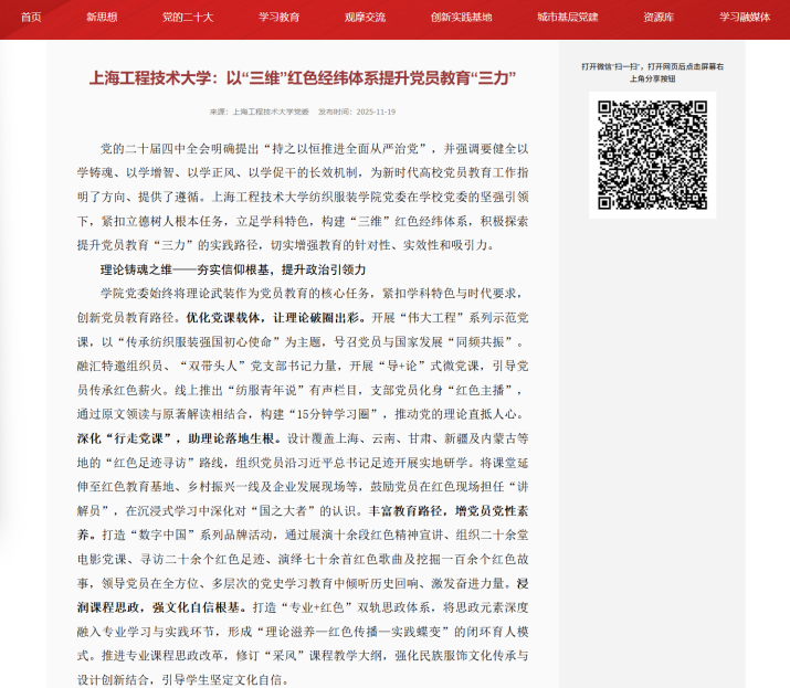 2025年11月,上海智慧党建网以《上海工程技术大学:以“三维”红色经纬体系提升党员教育“三力”》为题,专题报道纺织服装学院党委在学校党委的坚强引领下,紧扣立德树人根本任务,依托学科特色,精心构建“三维”红色经纬体系,积极探索提升党员教育“三力”的创新路径。