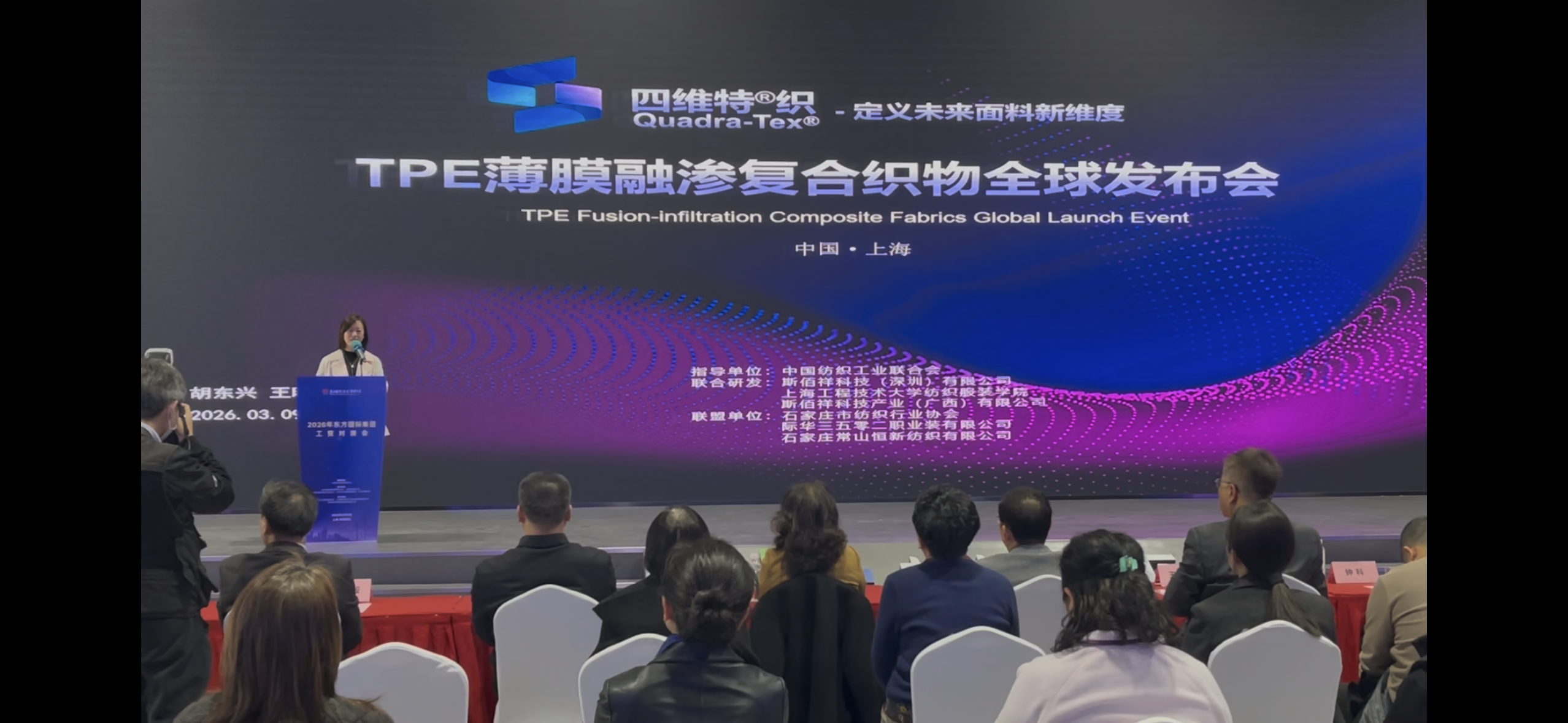 会上,来自深圳市的斯佰祥科技有限公司正式发布了四维特@织(Quadra-Tex@)面料体系。该面料复合技术由斯佰祥科技有限公司与上海工程技术大学纺织服装学院共同合作开发,能够赋予不同面料卓越的防水透湿性能。与传统防水透湿膜技术相比,该体系在实现优异功能性的同时,更加注重绿色环保理念,体现了纺织新材料技术创新与可持续发展的深度融合。