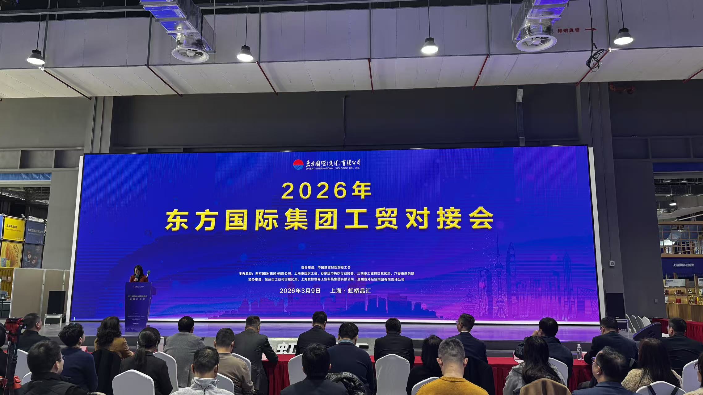 2026年3月9日,东方国际集团工贸对接会在上海虹桥品汇举行。来自全国各地的纺织企业齐聚一堂,围绕纱线、面料及终端产品等多个环节,集中展示了各具特色的创新产品与解决方案,共同探讨纺织服装产业链协同创新与高质量发展的新路径。我院院长辛斌杰出席本次对接会。
