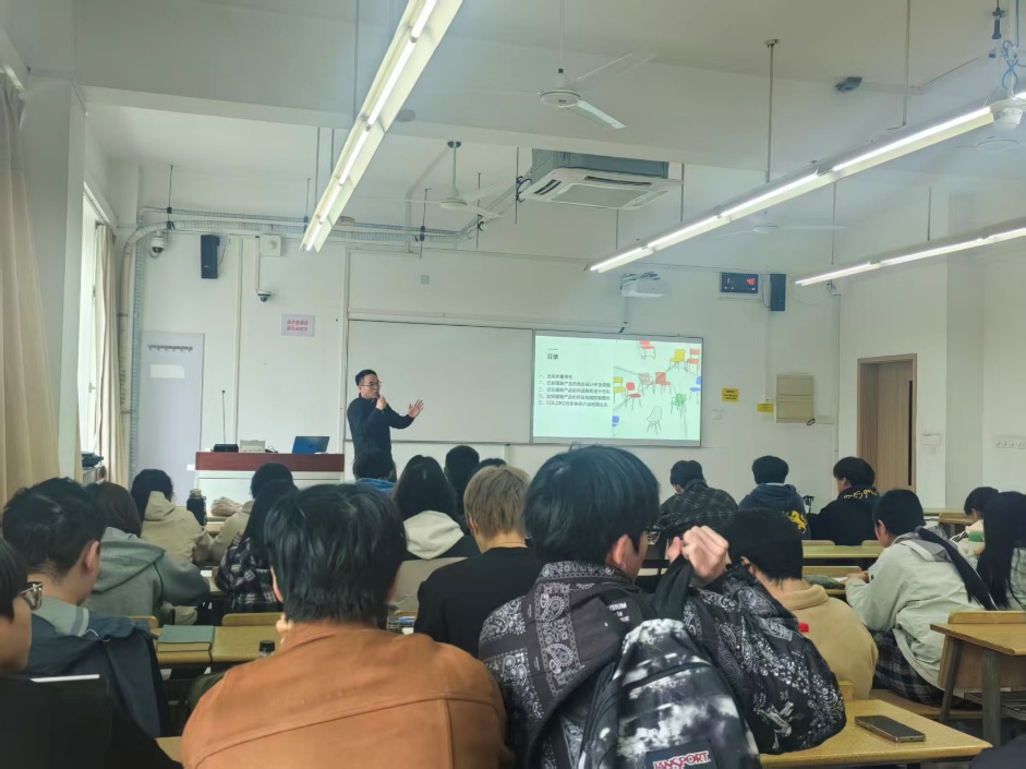 为充分发挥产业优势和校企协同育人作用,进一步推动生态纺织品着色原理课程的产教融合实践与探索,4月23日,纺织工程系邀请上海元彩科技有限公司资深工程师米曦走进“生态纺织着色原理”课堂。讲座中,米曦以“纺织服装产品开发中的色彩应用”为主题,结合企业实际案例,从行业技术革新、产品色彩设计开发流程、市场需求导向的产品创新等维度展开讲解。他通过展示企业经典产品案例,详细剖析了“色彩设计-材料选择-工艺实现”的全链条逻辑,并重点分享了颜色技术前沿技术在生产中的应用,让抽象的理论知识变得直观生动。展望了未来颜色应用的发展趋势。