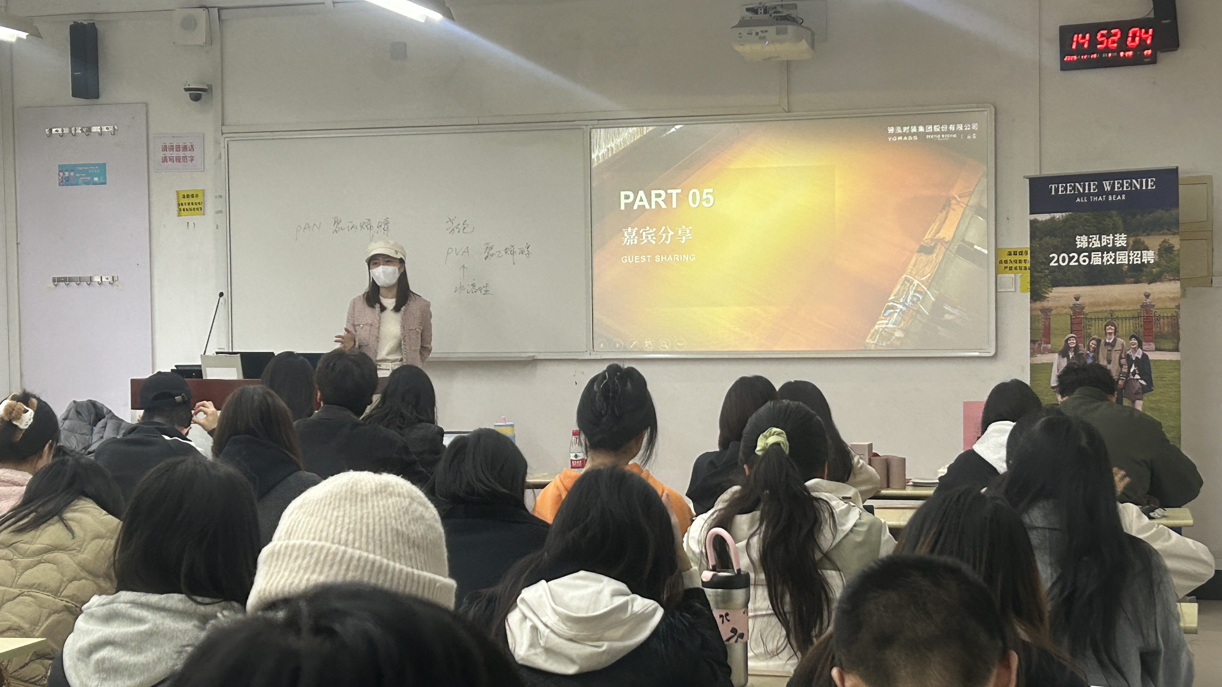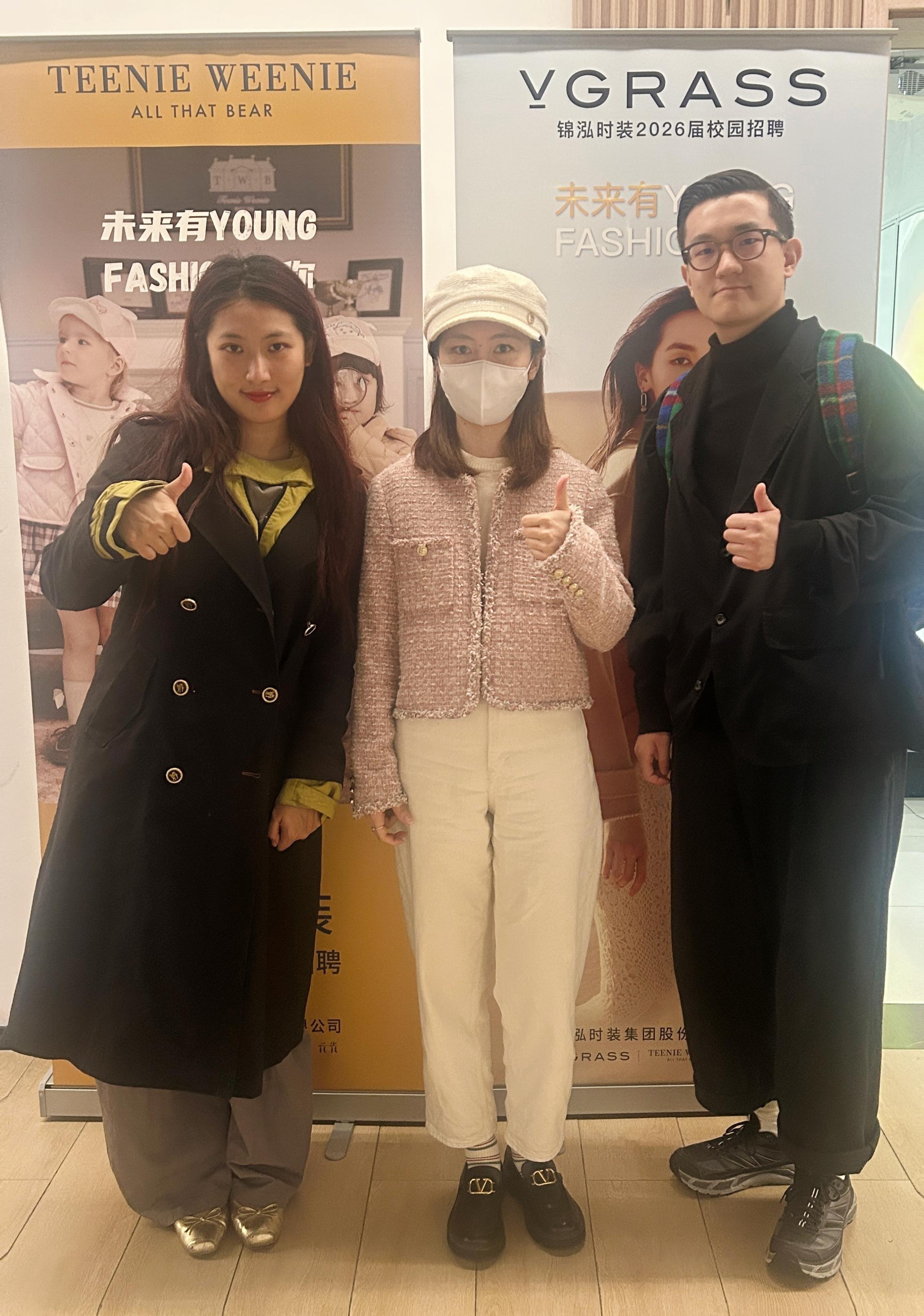 2025年11月18日,上海工程技术大学纺织服装学院校友张洋铭、颜丽华在锦泓集团校园招聘现场重返母校,开展2026 届校园招聘宣讲活动,为学弟学妹搭建职业桥梁。