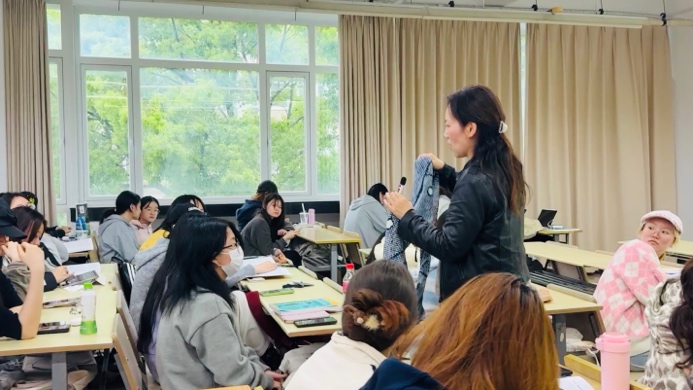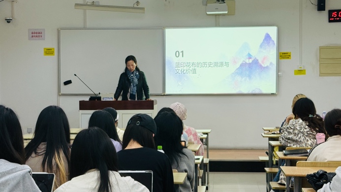 课堂上,孙文静结合蓝印花布的历史渊源、文化价值、工艺特色及创新应用等内容进行了讲解,并结合蓝印花布在现代服饰中的材质运用、产品设计与实际穿着中的表现,与学生分享了传统印染技艺在当代服装中的传承与创新。