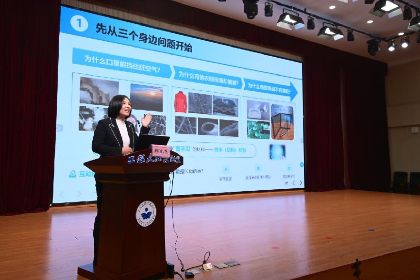 郑教授从口罩防护、衣物调温、表面自清洁等生活场景切入,用通俗易懂的语言讲解纳米材料的科学原理。他形象地阐释了纳米尺度之微小,以方糖与白糖的溶解对比为例,揭示纳米材料因表面积大、结构特殊而具备的强大功能。讲座重点科普了纳米纤维高效过滤、智能热管理织物、废旧衣物再生利用、荷叶仿生自清洁等前沿技术,引导学生从原料、能耗、耐用性、循环利用四个维度认识 “绿色材料”,传递低碳环保、可持续发展的科学理念。