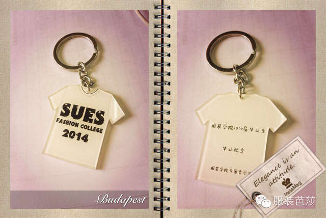 这个钥匙圈由服装学院为毕业生特意定制。T恤外形具有服装学院的特色,而上面的印花字母SUES·FASHON COLLEGE则寓意指我们上海工程技术大学服装学院。简单的设计方便毕业生们随身携带,随时随地能想起在校园里度过的青葱岁月。