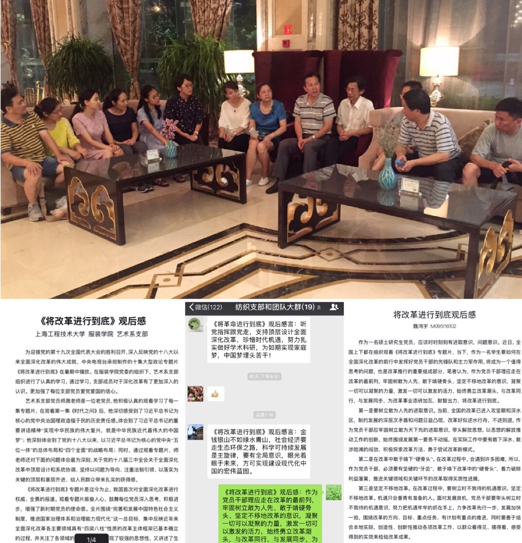 观看后,党员们纷纷表示触动很大,感触良多。服装艺术教工党支部书记张晓燕说,改革的过程和背后的故事是艰辛的,但同时也体现出了党对改革的决心,以及带领人民群众创造、创新和奋斗实现中华民族伟大复兴的信心。学生党员王康表示,作为当代大学生,我们应该坚决拥护国家的领导,支持中央进行改革,让人民群众走向小康,不忘初心,砥砺前行,实现中华伟大复兴的中国梦。