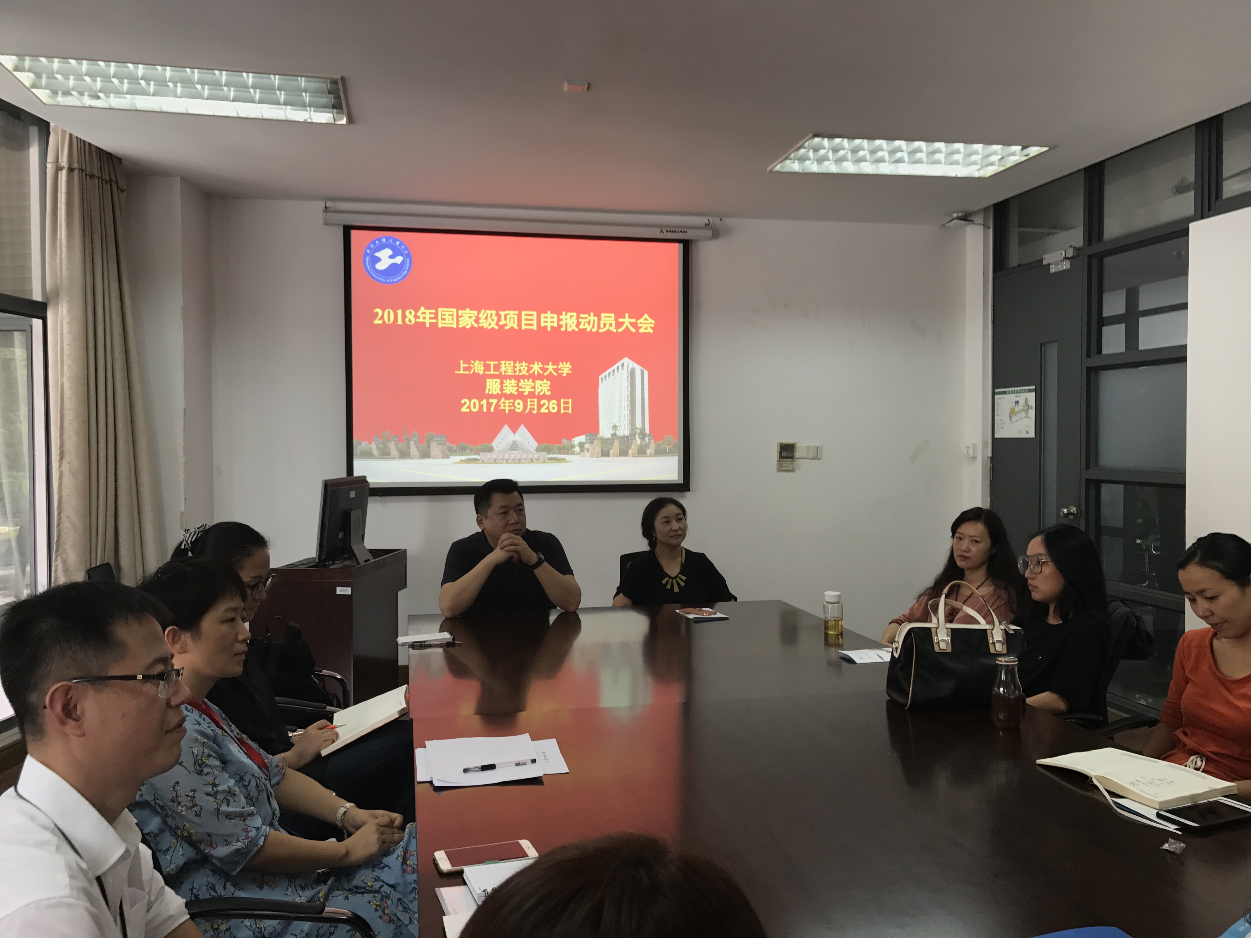 2017年9月26日,服装学院于艺术楼举行了关于2018年国家级项目申报动员大会。服装学院院长谢红教授和副院长胡越教授主持了此次会议,出席该会议的还有获批2017年国家级青年科学基金项目、2017年度教育部人文社会科学研究一般项目、2017年度全国艺术科学规划项目、2017年度国家社科基金项目等教师以及准备申报2018年国家级项目的各位教师。
