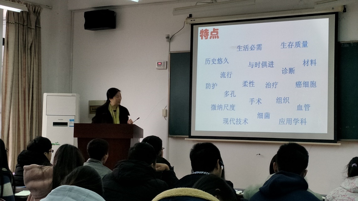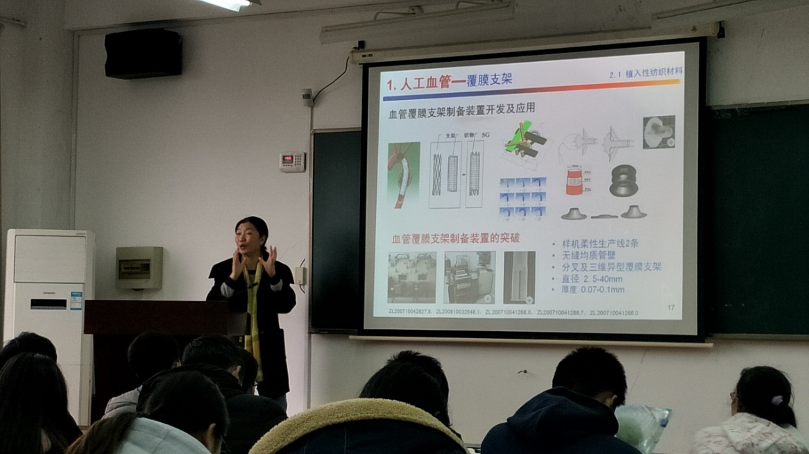 王教授的演讲内容丰富,生动有趣,通过展示医用纺织品实物(人工血管)以及播放手术视频资料等教学方法,与同学们进行互动,让纺织专业的本科生对传统纺织科学有了一个全新的认识。值得一提的是,在这场将近90分钟的讲座里,王老师一直面带微笑,态度和蔼可亲,在座的每一个人听的都很认真,她的这种科学素养和师者风范值得我们每一个青年教师学习。