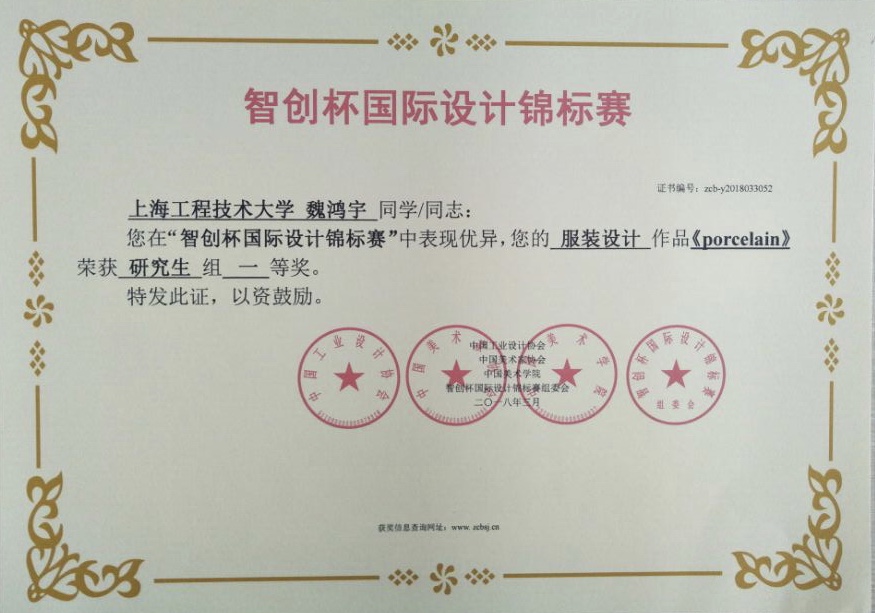 服装学院艺术与时尚设计专业研究生魏鸿宇同学在导师袁蓉副教授的指导下,他的设计作品《porcelain》荣获“智创杯”国际设计锦标赛研究生组一等奖。