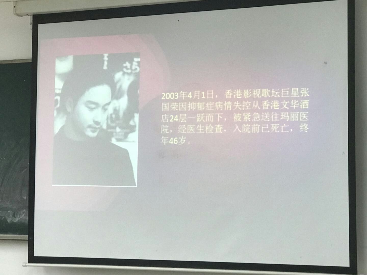 黄佩珺同学还特别提及了张国荣,他作为香港影视歌坛巨星旁人以为他有了一切,无论是他本人还是身边的人,都没有关注他的情绪极端化,文华酒店的那一跳世界都为之哭泣。黄佩珺同学也由此引出了我们一定要对身边的人多加关心,将心理疾病抑郁症重视起来。最后,黄佩珺同学提醒大家发现抑郁症的同学一定要及时报告老师,另外要建议抑郁症同学及时去找专业的医生咨询治疗。