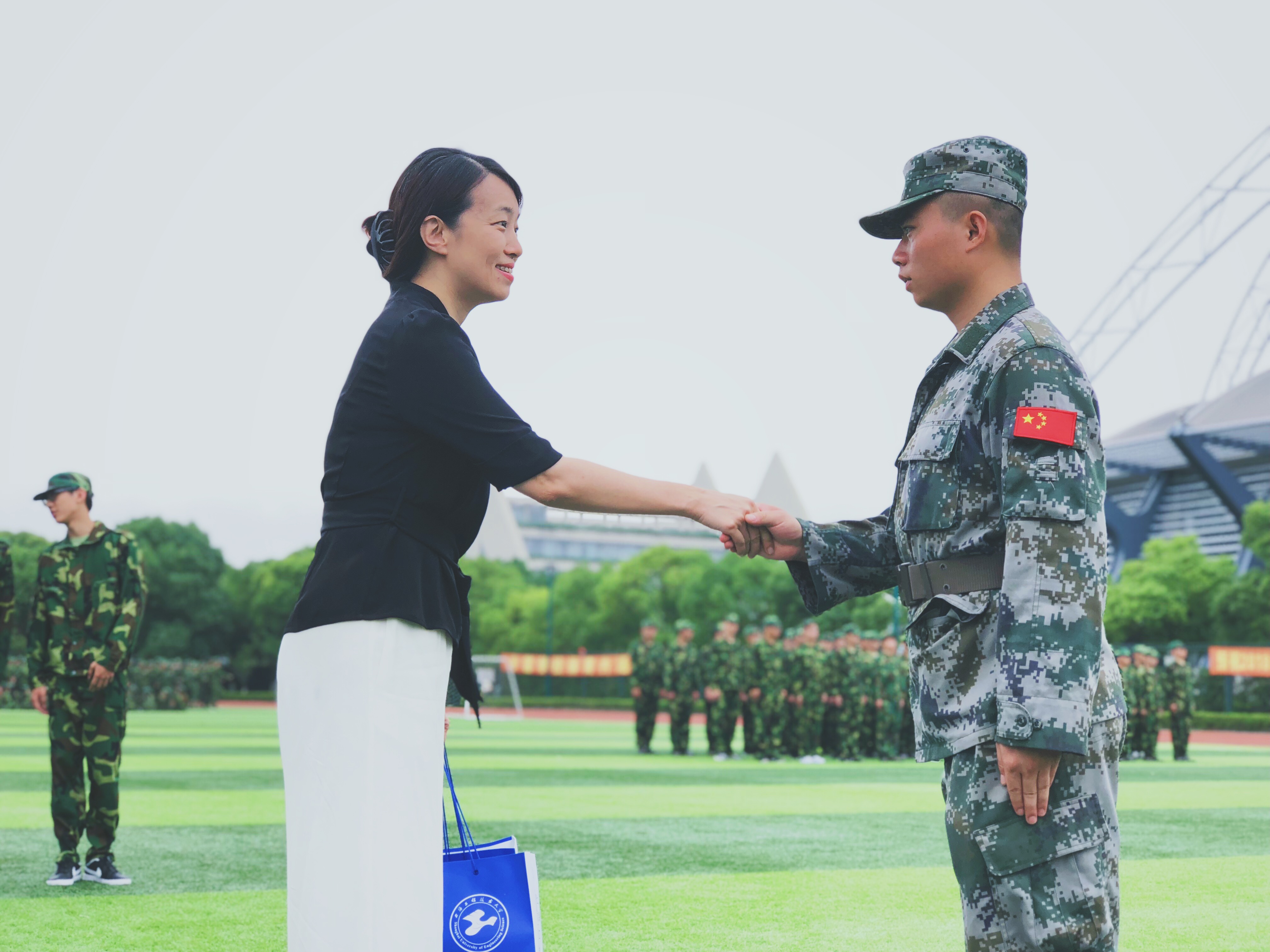 袁蓉老师首先代表学院党委对军训教官表示衷心的感谢,对参训的同学们表示亲切的慰问,对他们奋发向上、刻苦拼搏的精神给予充分肯定,希望同学们继续发扬不怕苦、不怕累的精神,展现严谨认真的训练作风和积极向上的精神风貌,并将艰苦军训中学会的严守纪律、吃苦耐劳的精神,带到今后的学习生活当中。