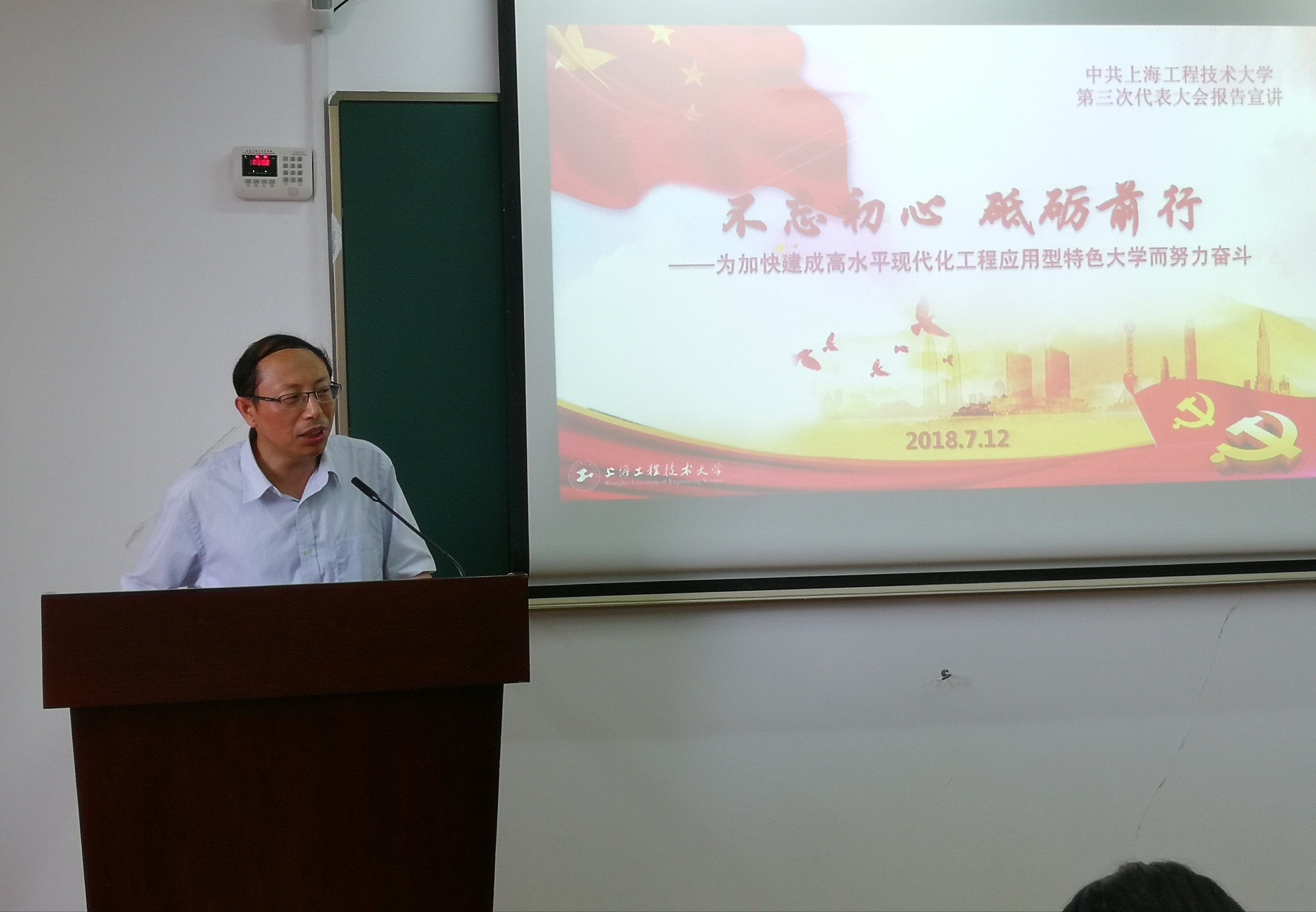 沈勤老师从大会的主题、大会基本情况、报告主要内容等三大方面展开宣讲,着重讲解了党代会报告的三大块、四个部分,结合学校目前重点工作和未来发展的高度分析了新时代新形势我们的奋斗目标和发展战略,从努力建成国内一流的高水平现代化工程应用型特色大学这一奋斗目标,到 “三大发展战略”和“新三步走”规划。紧密结合当前学校转型发展的生动实践,联系服装学院实际情况,为服装学院全体教职工领会大会精神实质作了重要讲解。