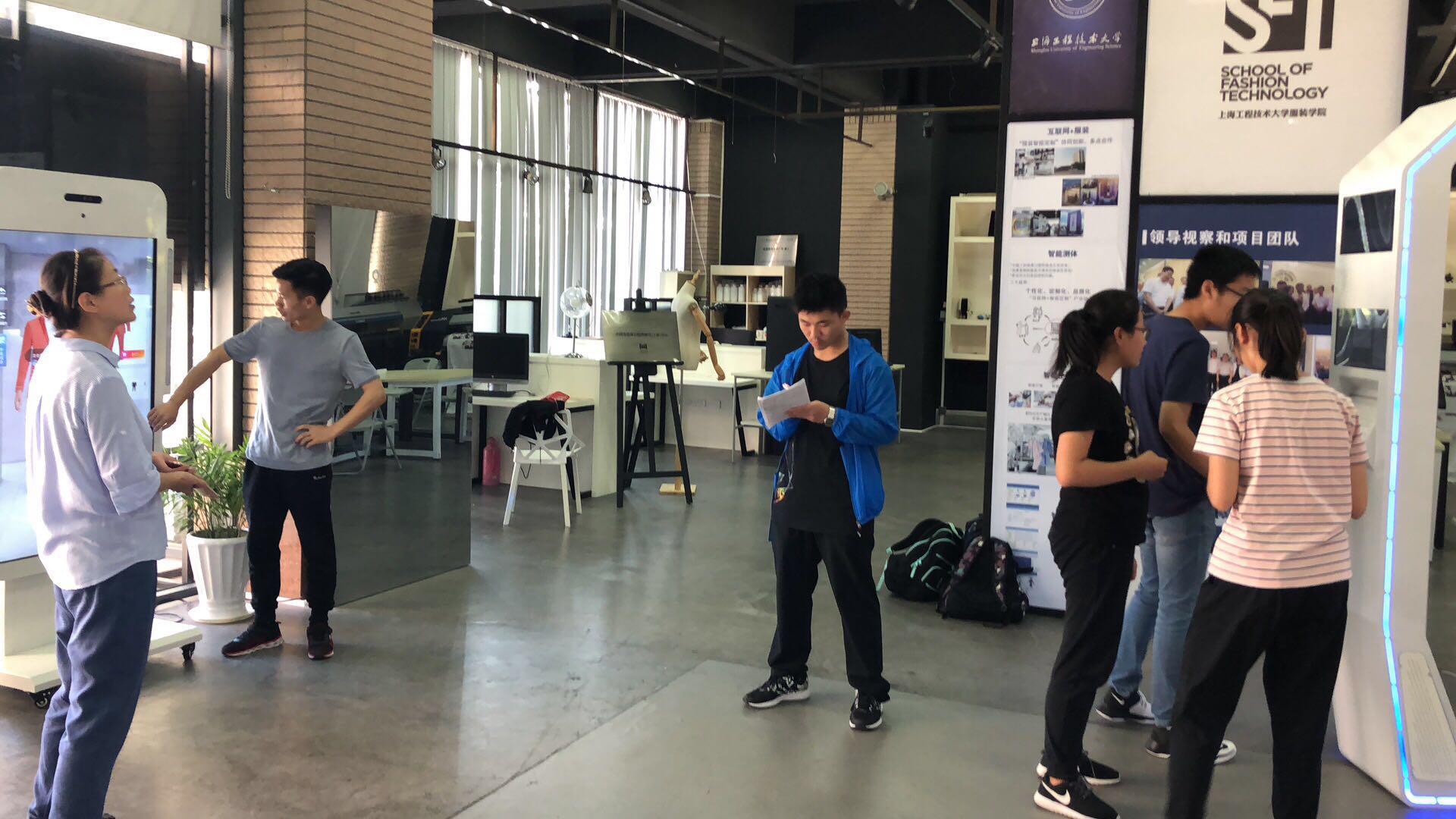 智能定制组则前往服装智能定制协同创新中心学习了智能定制仪器的操作,通过两两组合互相做人体采寸,再与智能定制云端测量的人体尺寸数据进行了比对,在实验室老师的帮助下循序渐进地开展了多次对照实验,进行定制课题的研究。