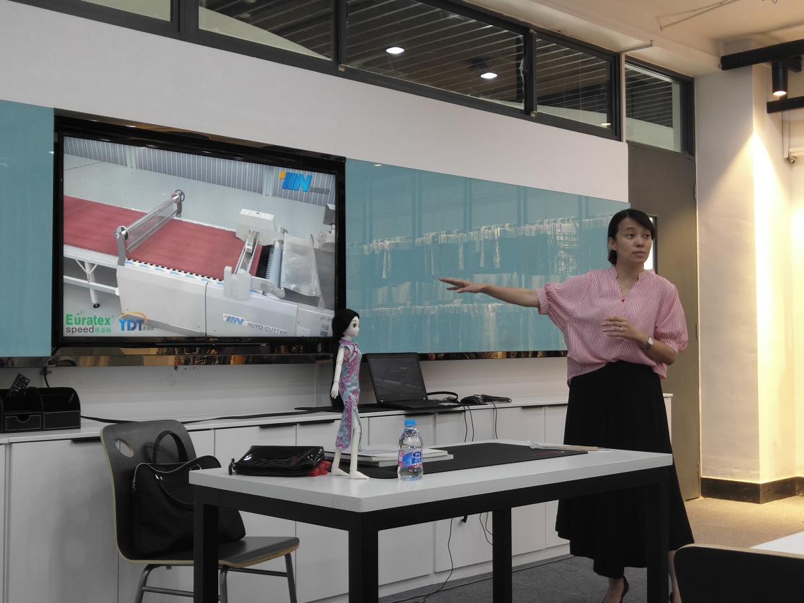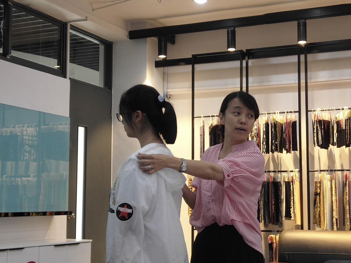 首先,袁蓉老师为海派旗袍组的同学们准备了旗袍人偶和DIY衣片,鼓励同学们自己动手尝试将衣片缝合,为人偶定制一套迷你旗袍,很好地激发了同学们对服装设计的兴趣。之后,袁蓉老师为服装智能定制组讲解了服装智能产业链的发展现状,对服装智能定制2.0和智能试衣镜等学院创新成果进行了详细介绍,并在现场示范了人体采寸,引导学员们探究人工与机器数据间的差异。