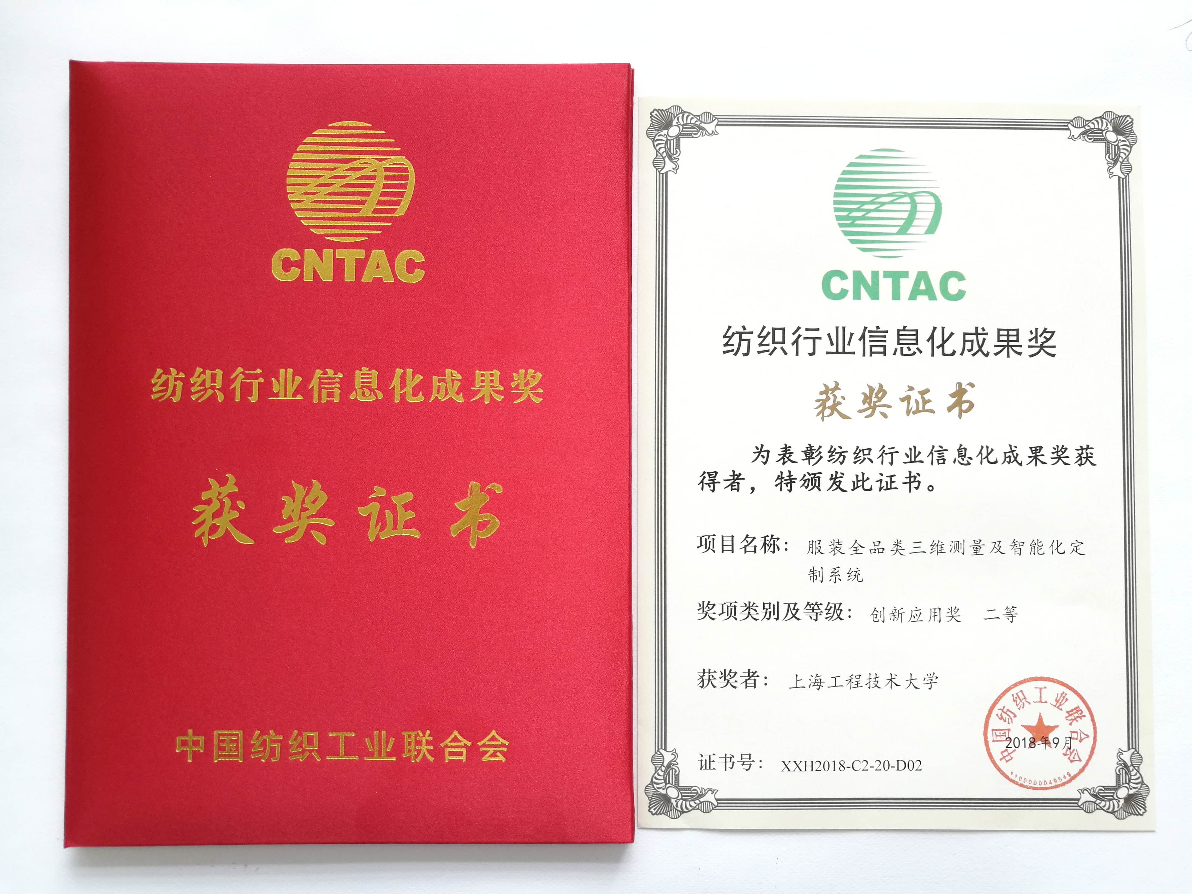《服装全品类三维测量及智能化定制系统》是上海工程技术大学与上海纺织(集团)有限公司,联合研发的基于远程测量的个性化服装定制系统。服装行业必须紧抓全球新一轮制造业变革和我国实施《中国制造2025》发展战略机遇,把握“互联网+”,形成与之相适应的快速反应体系,创造新的盈利空间。同时该项目通过引进吸收再创新,自项目实施以来申请七项发明专利成果,曾获工博会高校展区特等奖和上海市总工会科委奖等。
