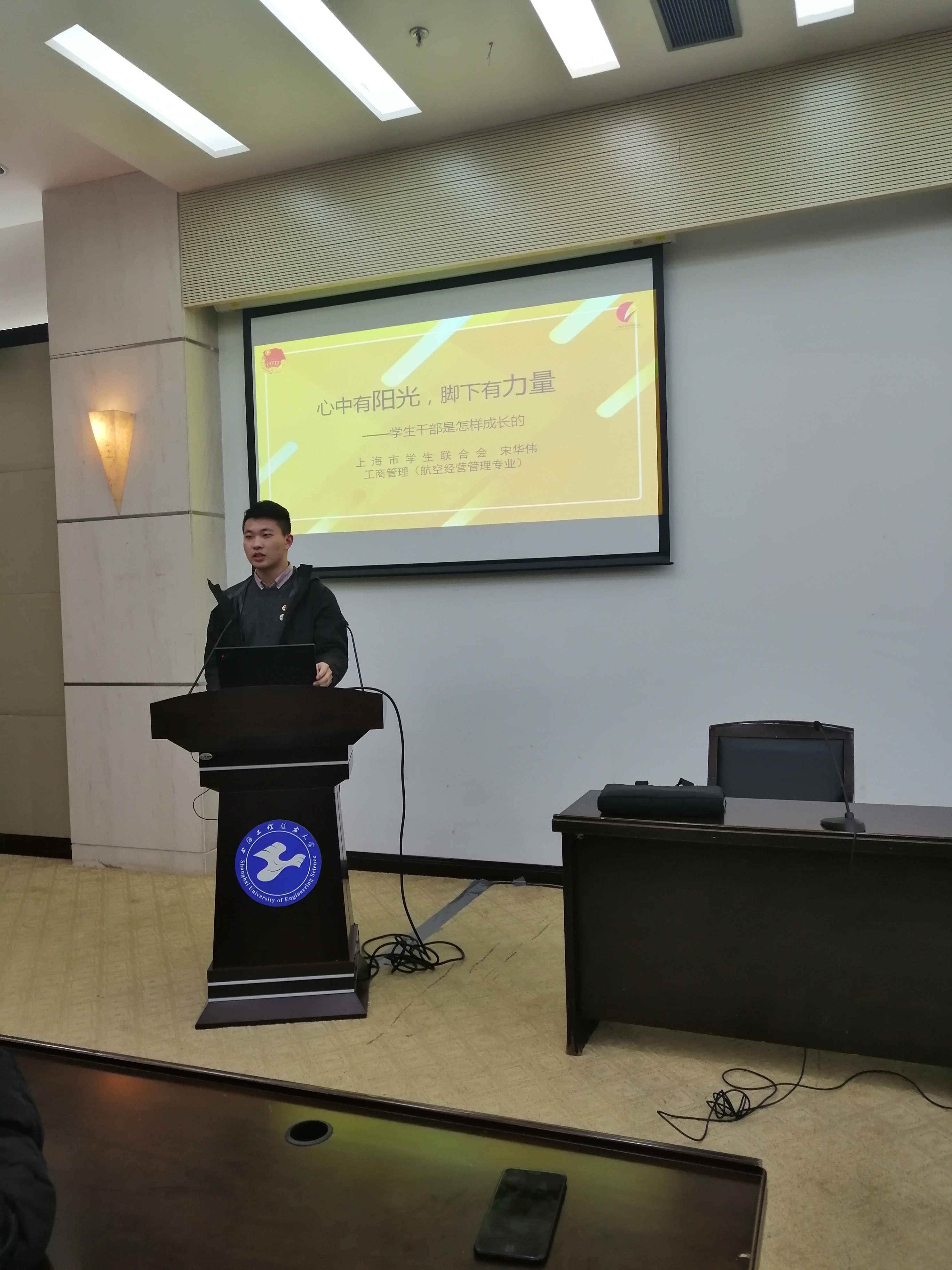12月5日下午,服装学院团委为实施开展青年团校、大学生领导力训练计划,助力学生干部成长成才,特意邀请上海市学联驻会执行主席宋华伟同学,在图书馆第三报告厅为培训班学员讲授第二课“心中有阳光,脚下有力量——学生干部是怎样成长的”。会议由服装学院团委副书记顾奇琦同学主持。