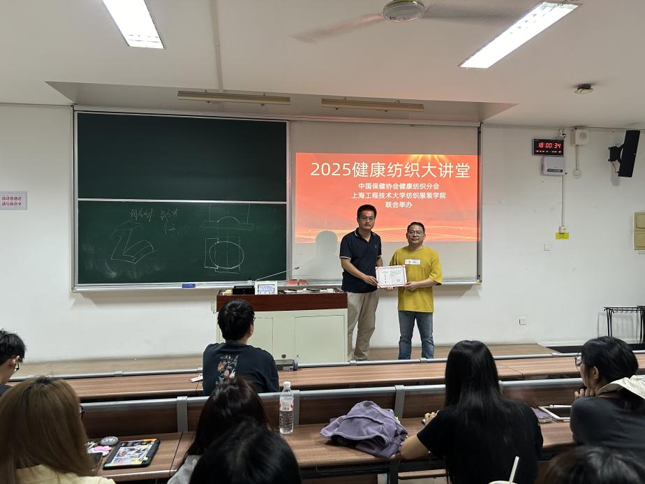 2025年10月14日,上海工程技术大学纺织服装学院联合中国保健协会健康纺织分会举办“2025健康纺织大讲堂”第八期活动。江苏聚喜纺织科技有限公司总经理张军以《“穿出健康、睡出健康”赋能品牌创新》为题,为材料与化工专硕解析健康纺织产业实践,校企共建的“现代健康纺织产业联合实验室”同步推进人才培养合作。