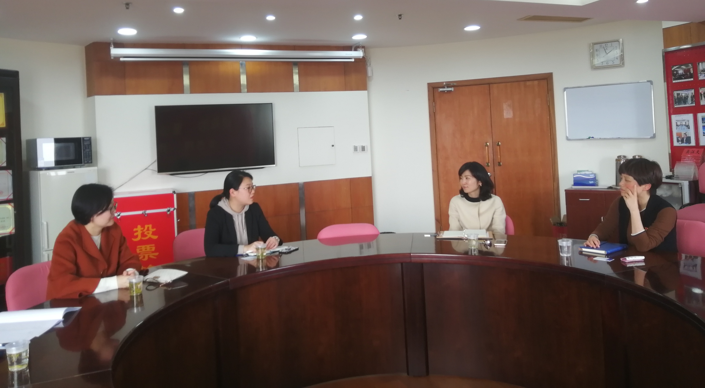 陆主任是服装学院纺织工程系2005届毕业生。毕业以来,她一直牢记学院老师教导,投入基层建设,曾在乡镇等多个岗位从事党建工作,目前受区委组织部信任,承担着区党建服务中心的筹建这一重要任务。她谈到松江区党建服务中心预计将于四月底开放,希望在党员教育等方面能为学校提供更多平台和资源,开展多方面、多层次的交流与合作,有力推进双方的全面融合和联动发展。