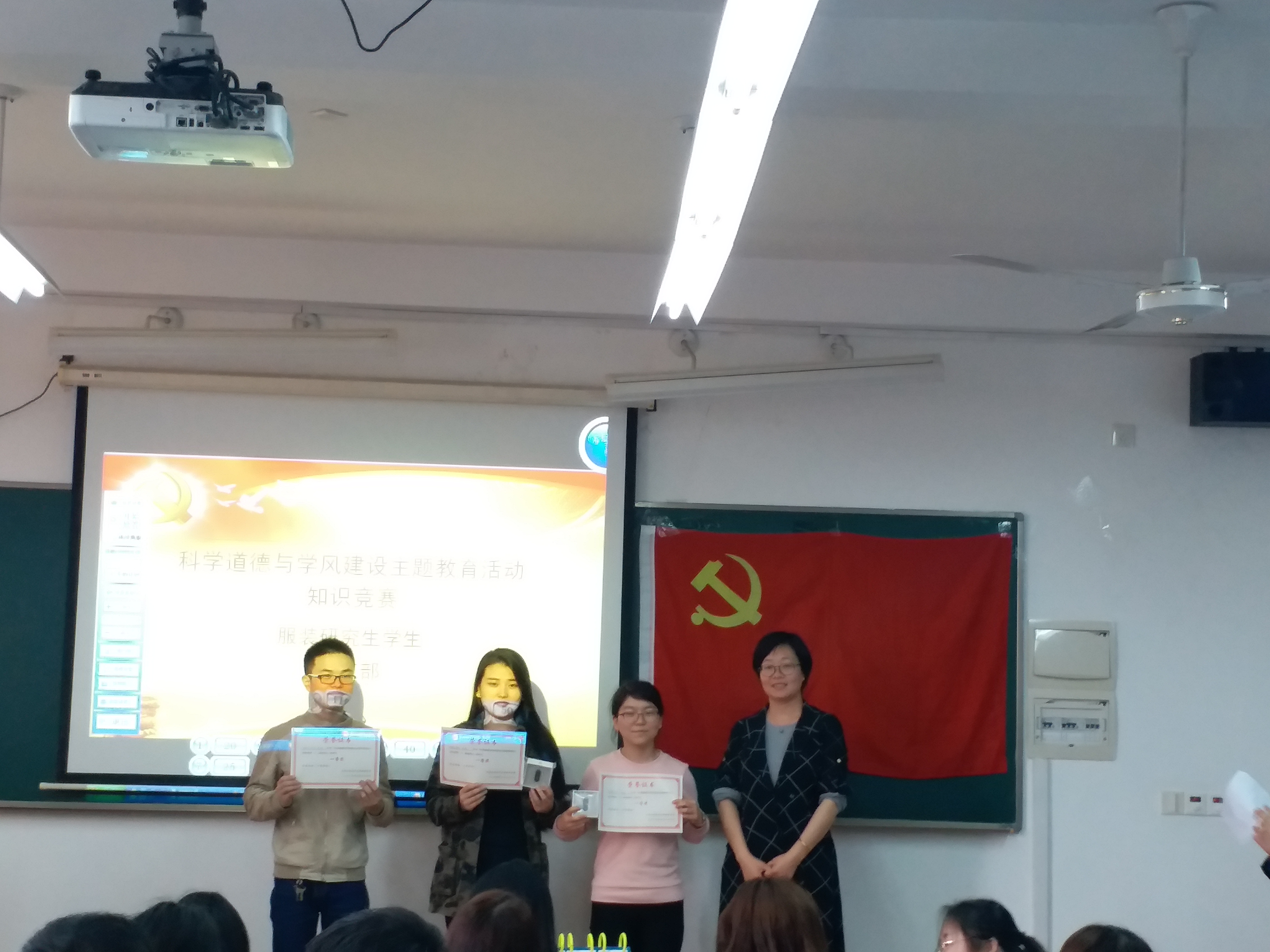 为深入学习贯彻习近平新时代中国特色社会主义思想、党的十九大精神和“科技三会”精神和习近平总书记关于科学道德和学风建设的重要指示精神, 4月24日下午,服装学院在艺术楼C310开展了2019年研究生“科学道德与学风建设”知识竞赛决赛。服装学院党委副书记谢志霞、组织员苌欣、研究生辅导员沈智莉、研究生秘书常文静,以及全体研究生党支部成员参加了此次活动。
