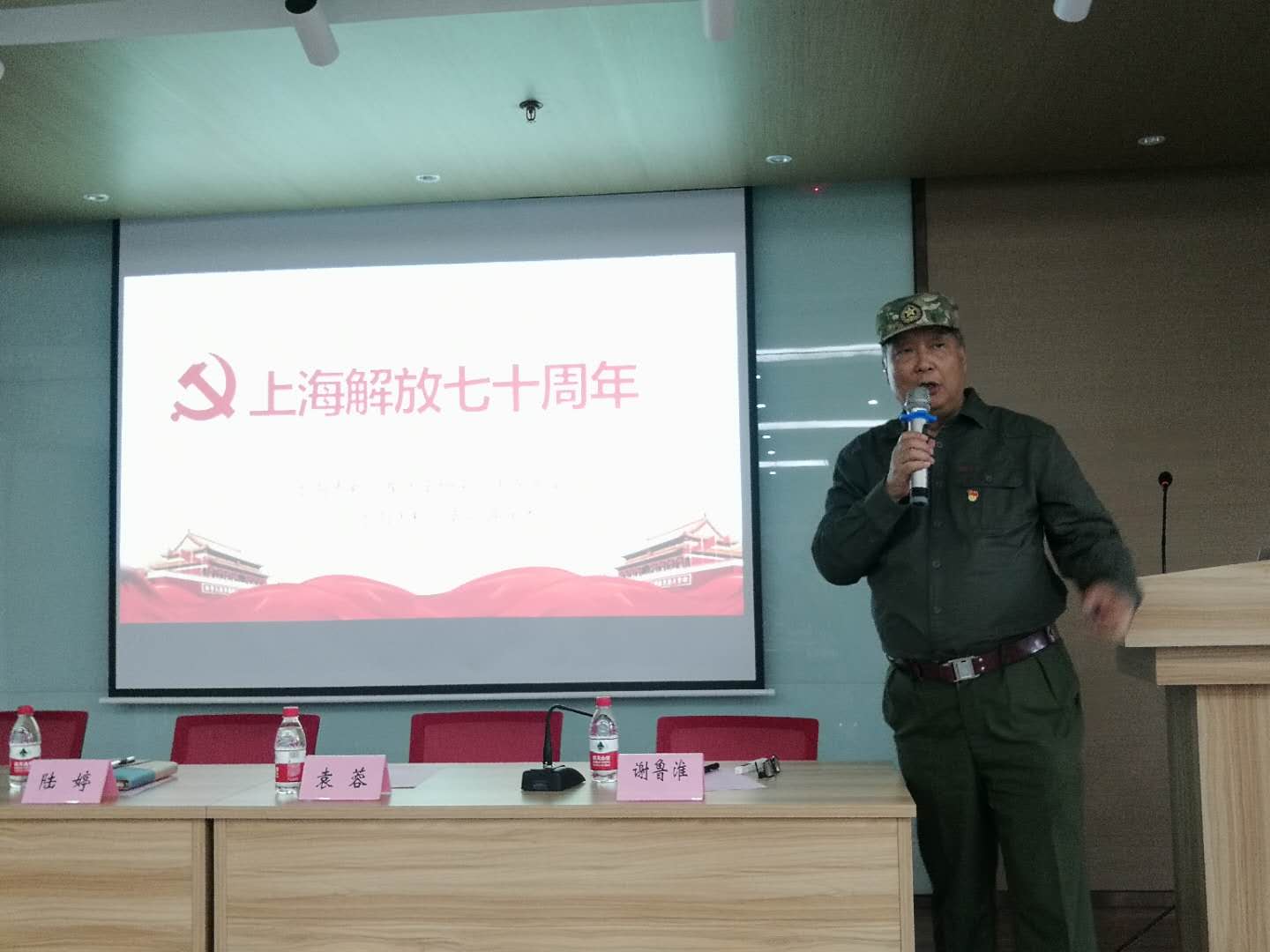 主题党日教育过程中,服装学院党委请了上海关工委讲师团、新四军浙东浙南宣讲团、松江老兵讲师团成员谢鲁淮老师为党员师生们带来了“不忘初心,重温上海解放红色故事”的专题党课。这支老兵团队,至今已到部队,机关,社区,学校讲述红色故事150场,听众超过3**次。松江报和松江电视台曾多次报导他们的事迹。谢老师本人当过十年坦克兵,父辈都是老兵,他以家人及自身亲身经历为大家带来了中国人民解放军解放大上海的故事,恰逢上海解放70周年之际,显得格外厚重。谢老师在党课上语重心长的对同学们说:“青年是国家的未来和民族的希望,现在的幸福生活在未来几十年是否能够延续下去,需要在座的每一位毕业生党员的传承和发扬,希望党员同志们为了国家的繁荣富强,不懈努力”。
