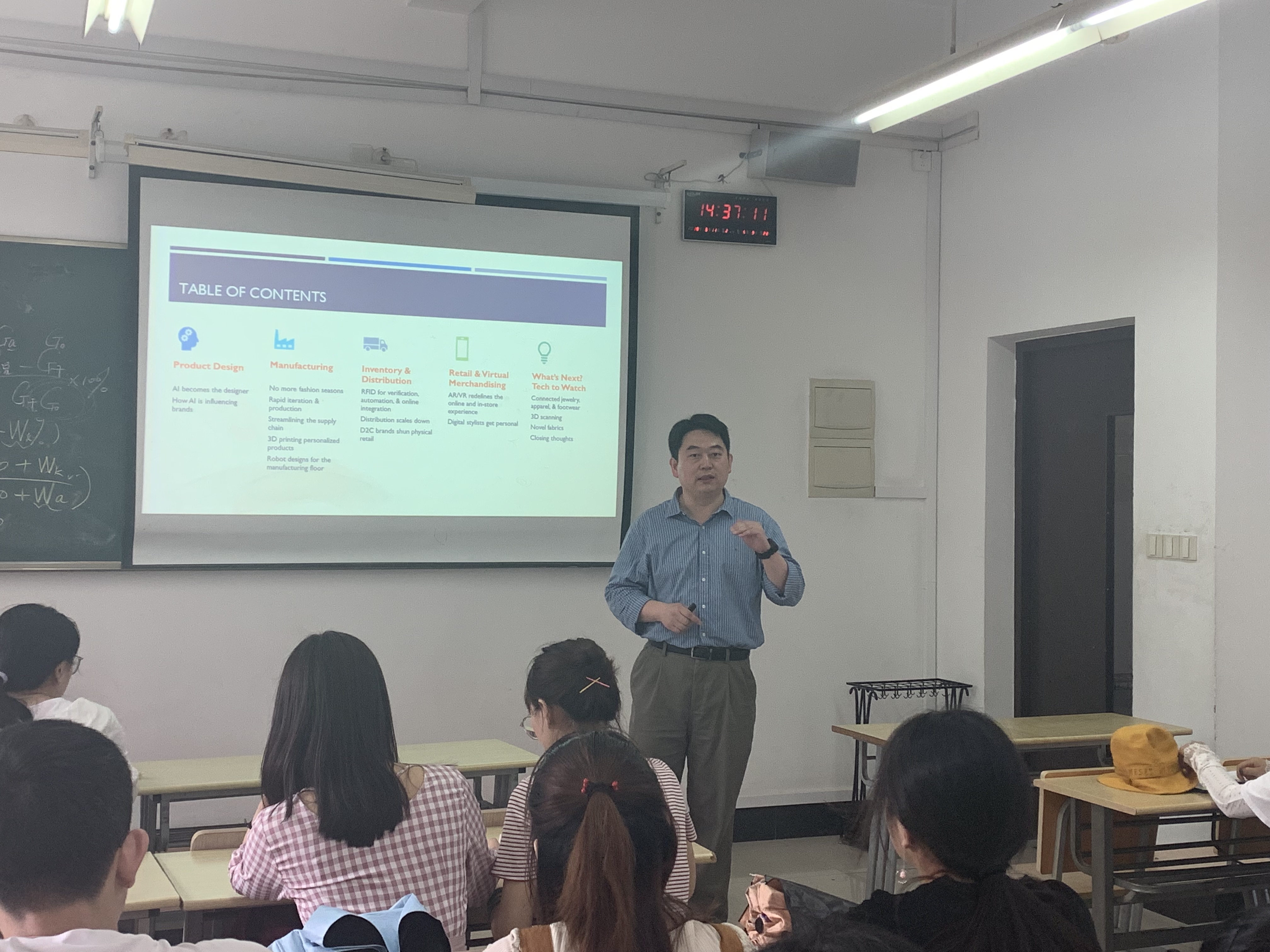 2019年6月11日下午,在教学楼C207,池庭副教授为服装设计与工程的研究生们演讲了名为“全球服装战略管理”的主题讲座。通过图文并茂与视频演示,与大家分享了全球服装战略管理的概念与策略。他在讲座中指出,今天的时装公司是由供应链经营的。有竞争力的公司有更好的设计与供应链,与竞争力较弱的公司相比。因此,了解供应链设计和管理对于时尚行业的专业人士来说是必不可少。