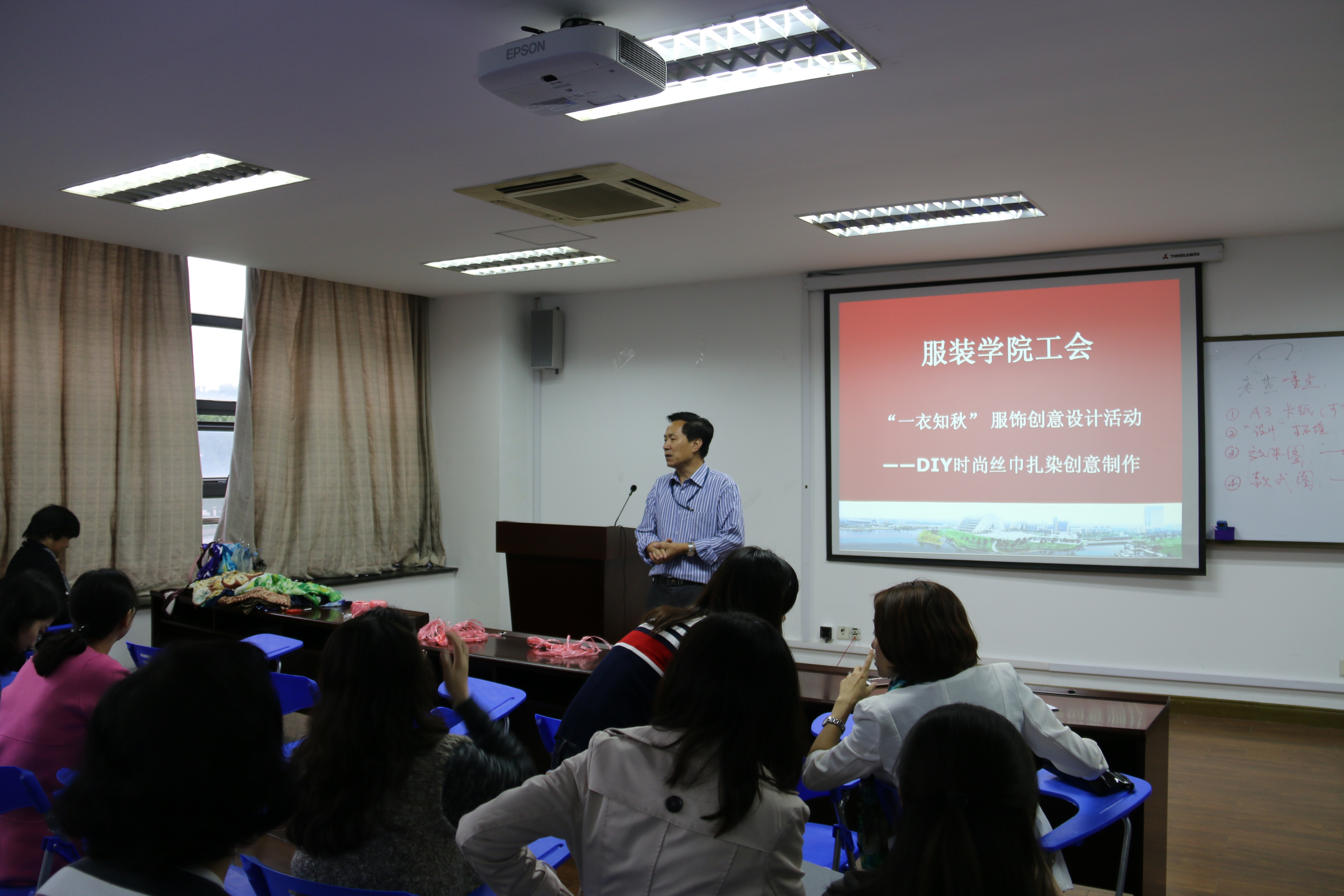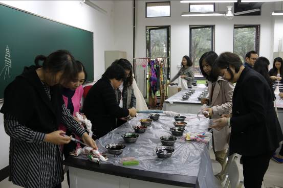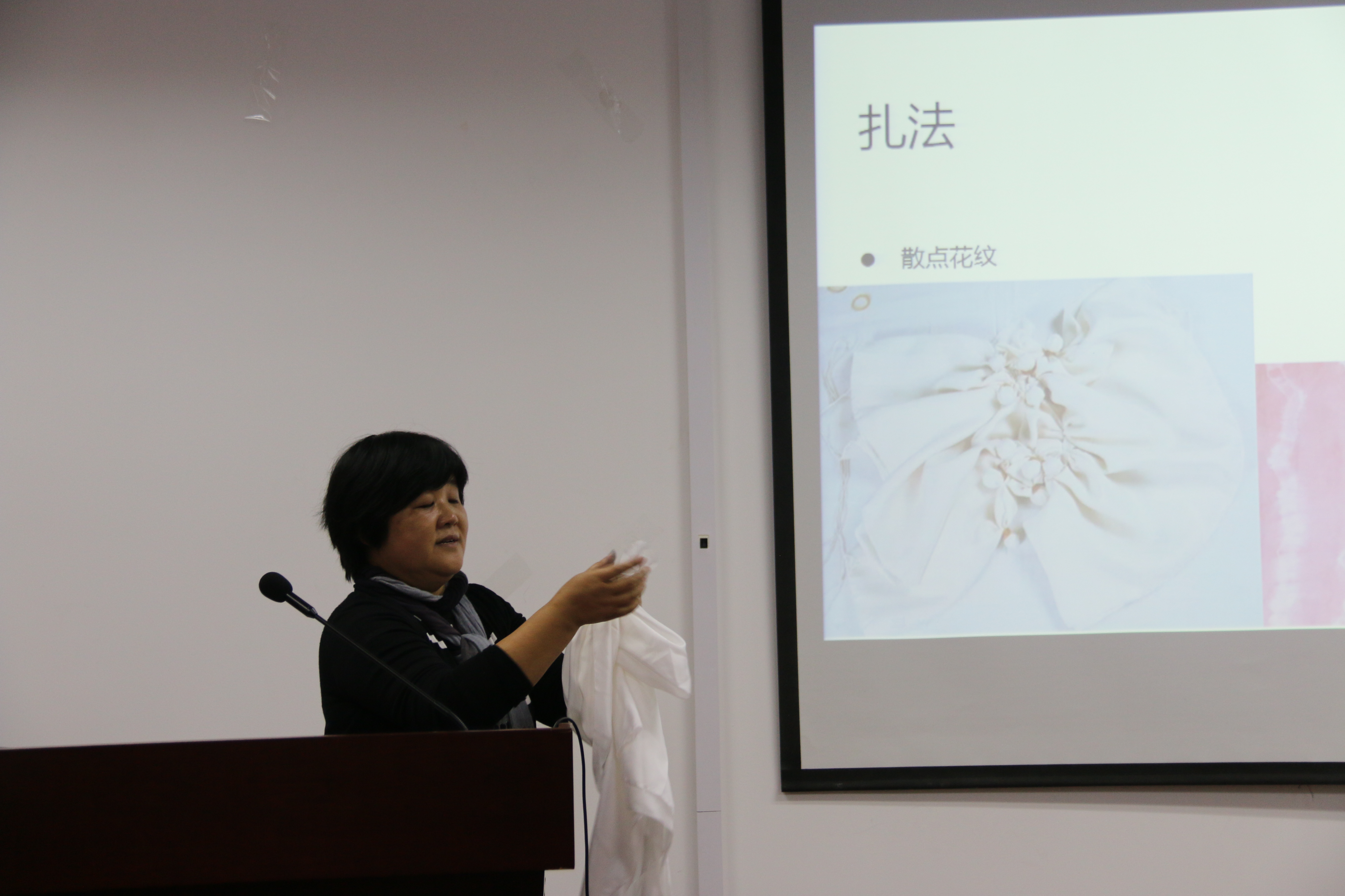 动由服装学院工会主席何文元主持,请服装学院的艺术家、扎染专家孙荪老师讲授中国传统的扎染艺术,并向大家讲述了扎染技巧。
