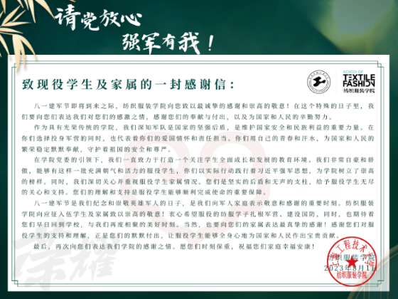 纺织服装学院党委一直以来高度重视国防教育工作,遵循“征集好入伍的、服务好在伍的、安置好退伍的”的工作要求,积极开展学院拥军优属活动,希望未来有更多的纺服学子能够从学校走进军营,在部队的舞台上施展才华,在军营大熔炉里淬炼成钢,让青春在党和人民最需要的地方绽放绚丽之花。